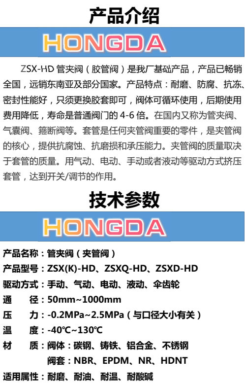 ZSX-HY管夾閥(膠管閥)是我廠基礎(chǔ)產(chǎn)品,產(chǎn)品已,遠(yuǎn)銷東南亞及部分。產(chǎn)品特點(diǎn):耐磨、防腐、抗凍、密封性能好,只須更換膠套即可,閥體可循環(huán)使用,后期使用費(fèi)用降低,壽命是普通閥門的4-6倍。在國內(nèi)又稱為管夾閥、氣囊閥、箍斷閥等。套管是夾管閥重要的零件,是夾管閥的核心,提供抗腐蝕、抗磨損和承壓能力。夾管閥的質(zhì)量取決于套管的質(zhì)量。用氣動、電動、手動或者液動等驅(qū)動方式擠壓套管,達(dá)到開關(guān)/調(diào)節(jié)的作用。